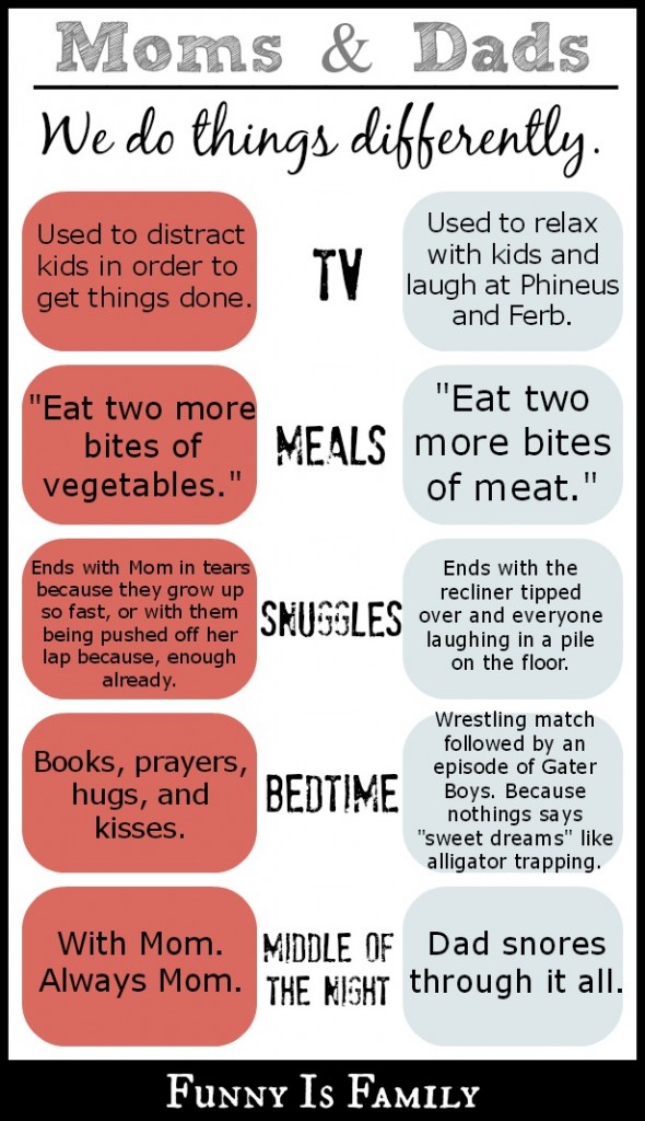 In our house, the kids know that Dad is “way more funner” than Mom, and that Mom is “more snuggly” than Dad. Dad is good for a two hour Lego…